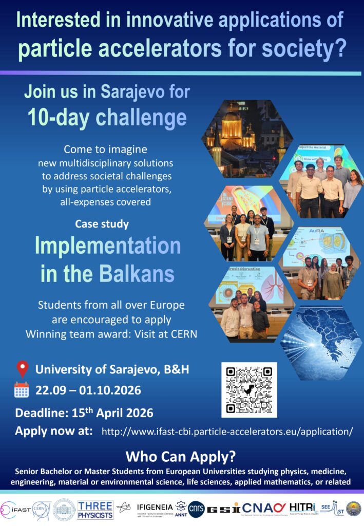 IFIGENEIA is proud to be an organiser of a ten-day event, a challenge based on innovations for students – CBI, that will be held at the University of Sarajevo. The goal is to present an innovative idea on the use of accelerators in applications that benefit the wider society (from materials science to medicine). The participating students will be divided into four international teams of six students each and will present their final ideas to an international jury after 10 days of joint work, on the 1st October. Before that, they will listen to selected expert lectures (first online several times, starting from September 1st), and then in person on September 22nd in Sarajevo.